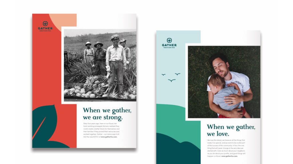 Another collaboration with Ziba Design. We helped the Kauai Community Federal Credit Union (the problematic KCFCU!) get back to their pineapple farming origins and the idea of Ohana and “talking story,” which defined the experience at KCFCU. The name Gather was unveiled with a whole new identity and design system by Ziba.